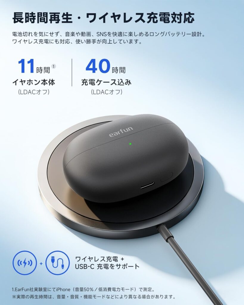 本体最大11時間、ケース込みで最大40時間使用できます。LDAC使用時はやや短くなります。
