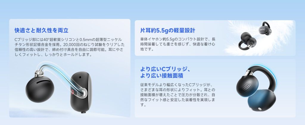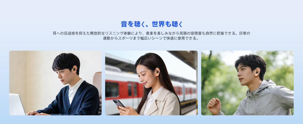 「ながら聴き」と「しっかり音楽を楽しむ」の両立を目指したイヤーカフ型イヤホンの新しい選択肢と言えるでしょう。