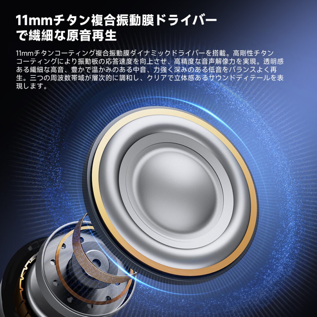 A. 11mmドライバー+LDAC対応で、価格帯としては低音量感と音の分離が優秀。ボーカルの近さは楽曲次第。細部の表現力は上位機(SONY/Bose/Apple)に及ばないものの、コスパ重視なら十分満足できます。