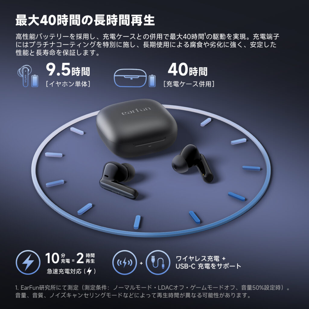 A. イヤホン単体最大約9.5時間、ケース込み最大約40時間。10分充電で約2時間再生の急速充電に対応。ワイヤレス充電も可。