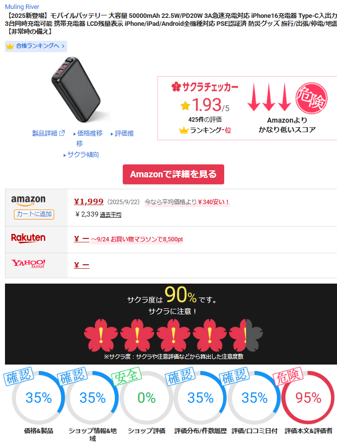 ✔ 「50,000mAhで450g」という表記は現代技術的に不可能で、容量詐欺の可能性が大