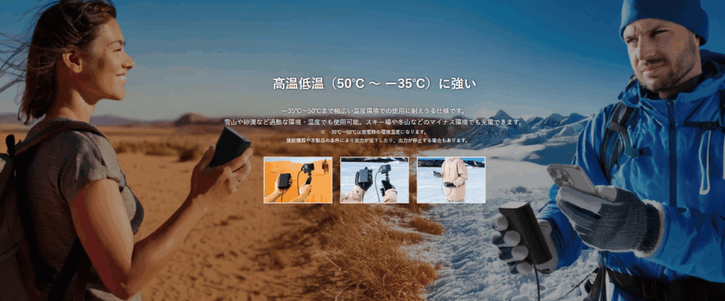 A. 動作温度が-35℃〜50℃と広いのが特徴。冬山や真夏の屋外でも動作余裕が出ますが、直射日光下や車内放置などの極端な高温は避けてください。