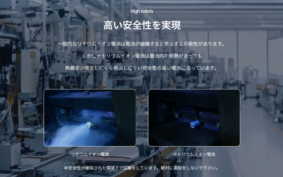 一般的なリチウムイオン電池は電池が損傷すると発火する可能性があります。しかしナトリウムイオン電池は電池内の発熱があっても熱暴走が発生しにくく発火しにくい安全性の高い電池になっています。